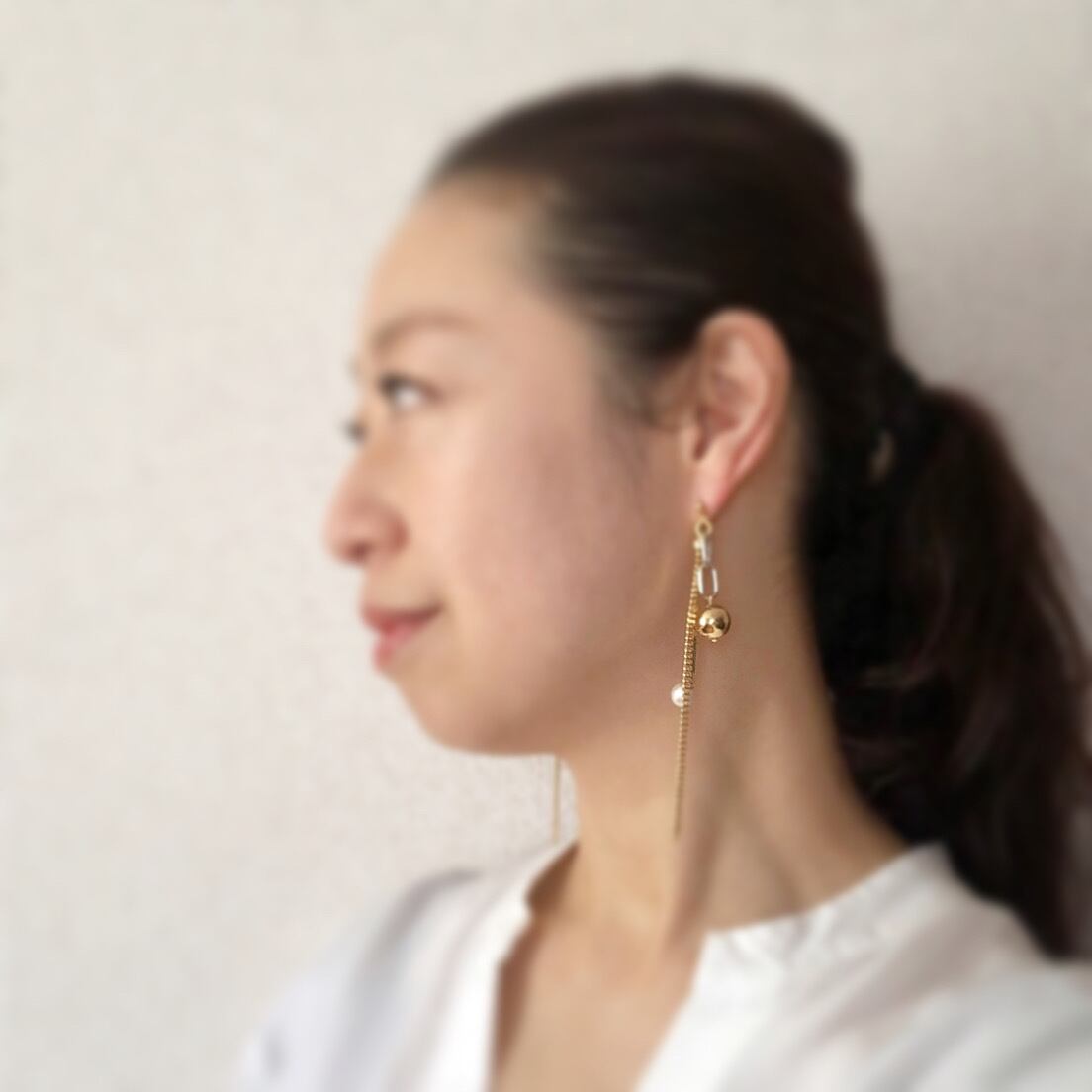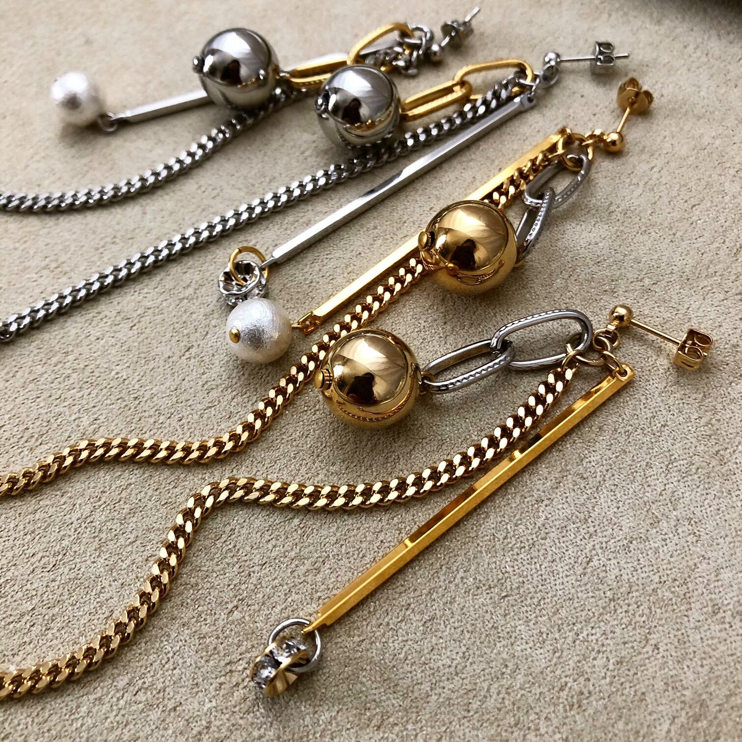 スティックメタルとチェーンのシャープなデザインに、コットンパールやメタルボールのころん。
