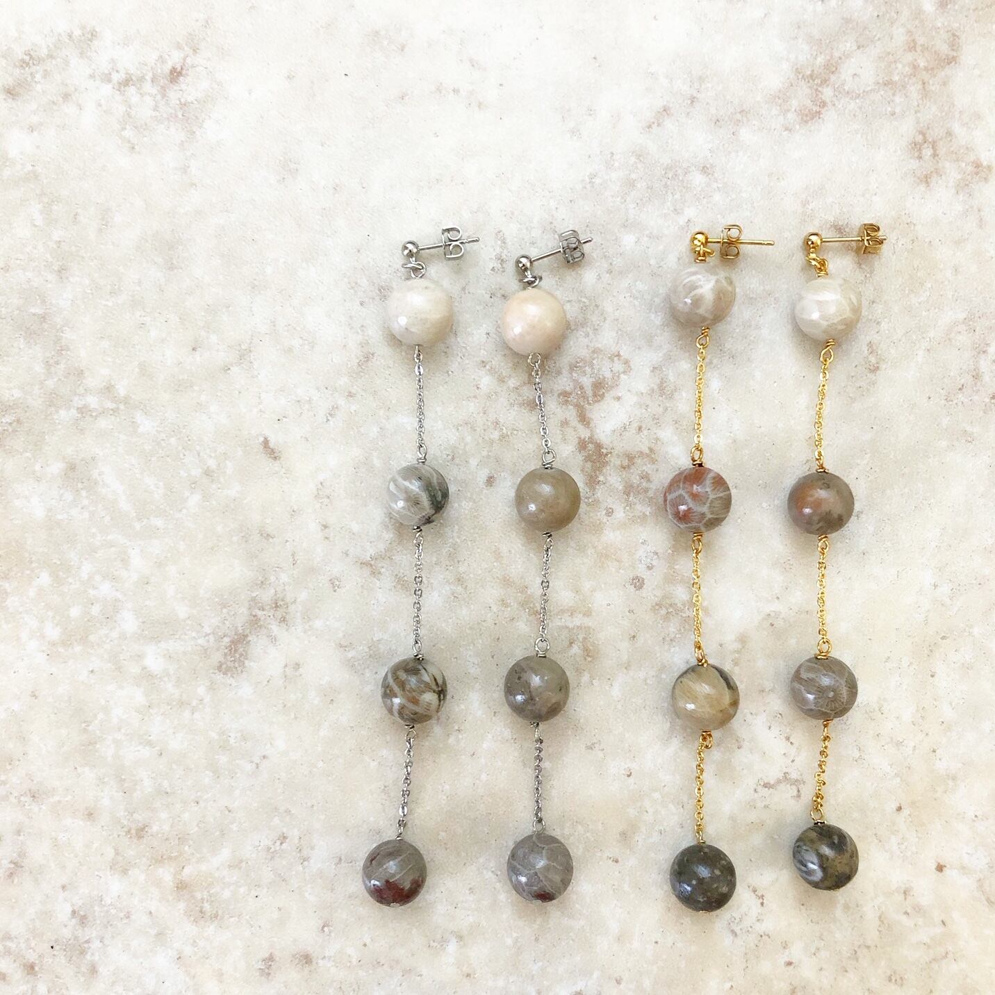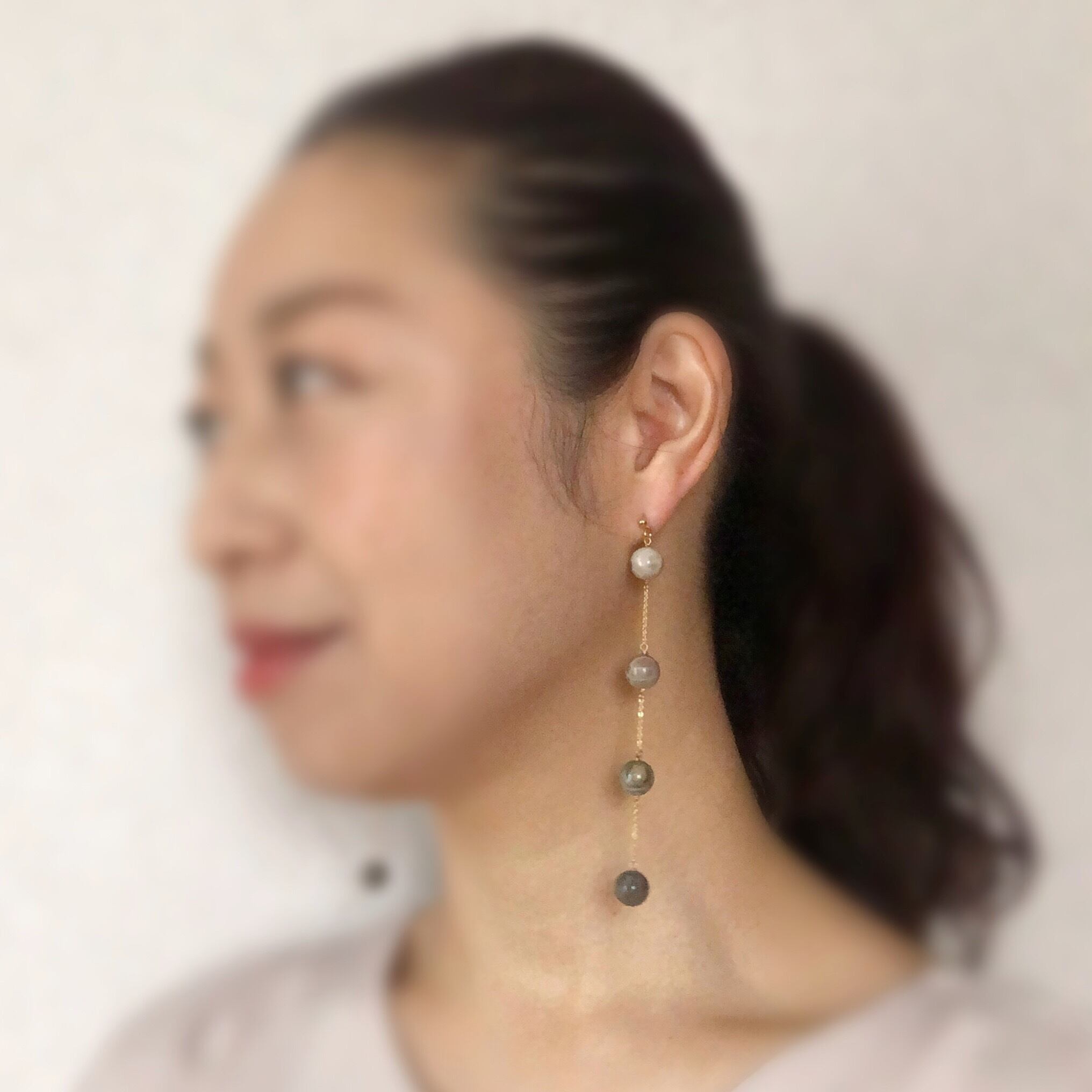 繊細なチェーンと天然石が揺れるロングピアス&イヤリング。