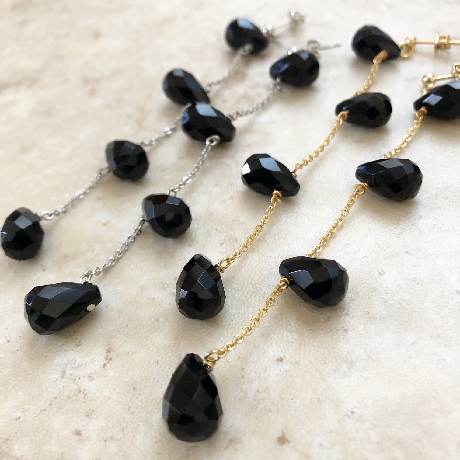 繊細なチェーンと天然石が揺れるロングピアス&イヤリング。
