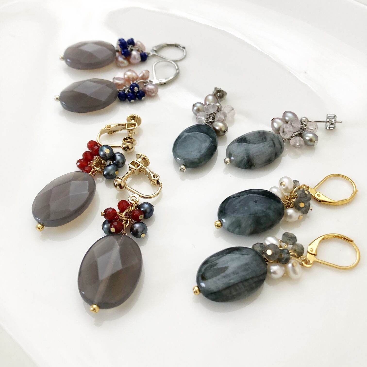 ポストキャッチ金具、チタンフック金具、イヤリング金具に交換できます。