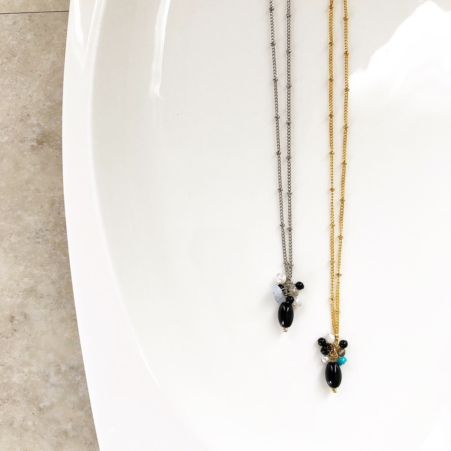 メインストーンは小さなナツメ型のオニキス。つぶつぶチェーンは長さを選べます。